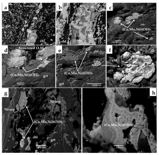 At the area of E. Vermio, there is abundant garnet (grossular) and calcite, while Ni is mainly hosted in chlorite, serpentine, and theophrastite (