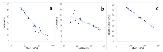 19]. A common feature of the E. Vermion, Olympos, Edessa, and Skyros small laterite occurrences, which are found on serpentinized harzburgites, is the gradual increase of Mn, Co, and Zn outwards of the chromite, attaining the greatest values at the periphery of chromite cores and in the Fe-chromite, reaching values up to 13.0, 4.1 and 2.1 wt%, respectively, and dropping off to negligible values in magnetite, as is exemplified by the plot of (MnO + CoO + ZnO) versus (MgO + FeO) content and the strong negative correlation between them (