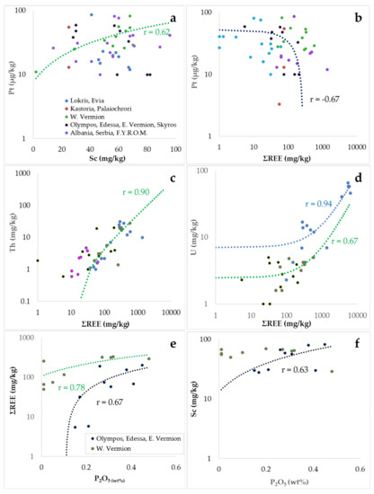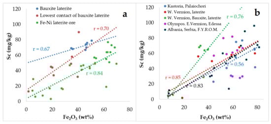 Figure 8). The majority of the Sc contents of lanthanides were 32–90 mg/kg in the Lokris deposits; 41–77 mg/kg Sc in the Kastoria, Palaiochori, and W. Vermion deposits; 30–82 mg/kg Sc in the Olympos, Edessa, E. Vermion, and Skyros Fe–Ni laterite occurrences; and 12–96 mg/kg Sc in the Albania, Serbia, and N. Macedonia, former F.Y.R.O.M., deposits (