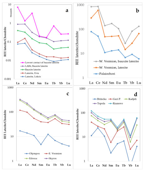 30]. Laterites from W. Vermion are characterized by positive Ce and Eu anomalies. In general, negative slopes are a common feature of the chondrite normalized REE patterns of laterites from northern Greece (