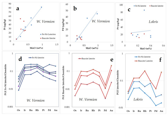 37]. A common feature of the studied deposits from the Balkan Peninsula, including two Fe–Ni laterite profiles from the Gouri-Perjuegjiun and Bitincka deposits of Albania, the Kastoria, and W. Vermion laterites, is the higher Pt than Pd contents in ores compared to parent peridotites, their concentration mostly occuring in the pelitomorphic and pisolitic–oolitic types (