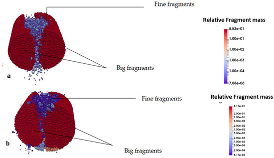 As the crack density intensifies, the irregularity of the fracture patterns within rock specimens become more apparent. These are shown with the fracture patterns at 90 cracks (Figure 11b–d), 180 cracks (Figure 12b–d) and 300 cracks (Figure 13b–d). Among these, fracture patterns at 180 cracks and 300 cracks show the highest irregularities. The irregularity of fracturing is further emphasized by examining the relative sizes of fragments produced. Figure 14 illustrates fragment masses for differing levels of damage. Relative fragment masses are calculated by identifying all DEM spheres forming a connected cluster and accumulating the masses of these spheres. It is the fragment mass relative to the original specimen. As the damage level increases, the number and range of masses of fragments increases markedly, as compared with pristine specimens (0% cracks) or mildly damaged specimens.
