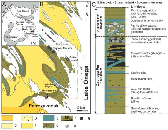 Location of sampling areas (A) and simplified geological map of the north-western part of the Onega Basin, Karelian Craton (B). Legend: Neoproterozoic: 1—ca. 635–542 Ma sandstones, siltstones, argillites, conglomerates. Paleoproterozoic: 2—ca. 1800–1650 Ma red quartzitic sandstones, quartzites, conglomerates; 3—ca. 1920–1800 Ma grey sandstones, siltstones, argillites, conglomerates; 4—quartzitic sandstones; 5—ca. 1975–1956 Ma gabbroids. Ludicovian Super-horizon, ca. 2100–1920 Ma: 6—picrites, picritic basalts, tuffs, tuffites, tuff-conglomerates, gritstones (Suisari Formation); 7—Corg-rich rocks (shungites), sandstones, siltstones, argillites, carbonates, basalts, andesibasalts, tuffs, tuffites (Zaonega Formation); 8—light-coloured agate occurrences; 9—black agate occurrences. (C) Simplified geological section of the studied area.
