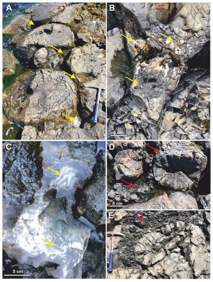 Figure 2. Field outcrop photographs illustrating black agates’ location in the Paleoproterozoic volcanics within Onega Basin LSH (ZF). (A) Agates in gas vesicles and inter-pillow lava space (Glubokii Navolok), (B) agates in the inter-pillow lava space (Glubokii Navolok), (C) banded agates in the inter-pillow lava space (covered by water) (Glubokii Navolok), and (D,E) interbeds of carbon-rich rock (“shungite”) in the inter-pillow lava space (Solomennoe). Yellow arrows point to the black agates, and red arrows to carbon-rich rock. - (3)