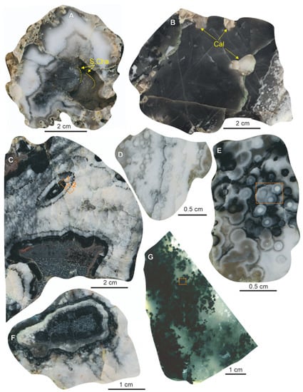 Photographs of Onega black agates in the Paleoproterozoic volcanics within the Onega Basin LSH (ZF). (A) Concentrically zoned agate with central cavity covered by sinter chalcedony (Glubokii Navolok), (B) uniform opaque agate with quartzine spherulites zone and large calcite inclusions (Suisari Island), (C) concentrically zoning agate with black ellipsoid (Suisari Island), (D) enlarged fragments of spherulitic zone from (B), (E) black and white spherulite agate (Glubokii Navolok), (F) concentrically zoned agate (Glubokii Navolok), (G) moss agate composed by colourless chalcedony with black-rounded segregations of carbonaceous matter (Suisari Island). S. Cha—sinter chalcedony, Cal—calcite. The areas of optical microscopy analysis are marked with orange squares, explanations in Figure 4.