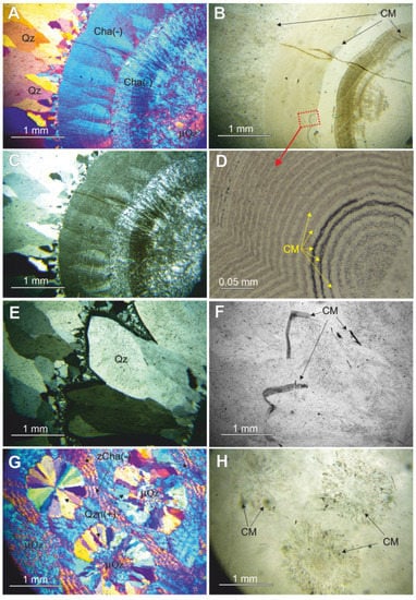 Concentrically zoning agates (CZ), recognised as nodules, exhibit alternating black and white bands (Figure 3C,F). Black bands are usually localised parallel to the outer shell of an agate nodule close to the contact with the host rock. The thickness of black bands ranges from 0.3 mm to 1 cm. Additionally, black ellipsoids with a size of up to 2 cm were recognised in the inner white part of CZ agates. The petrographic study revealed that the silica matrix of CZ agates is comprised of alternating layers of length-fast chalcedony (with the c-axis situated perpendicular to the fibres), and micro- and macro-crystalline quartz (Figure 4A–C). The thick black bands in the outer part of agates and black ellipsoid inside nodules (Figure 3C) under low magnifications appear to be uniform and completely formed by CM, whereas under high magnification, it shows that they consist of numerous fine concentric bands of microcrystalline quartz and chalcedony, between which carbonaceous matter is disseminated (Figure 4B,D). CM in CZ agates are mostly concentrated in zones of fine-grained quartz and chalcedony. The black jagged bands containing carbonaceous pigment with a thickness up to 0.3 mm occur both in the margins and central parts of the nodules around the ellipsoid (Figure 3C). The optical microscopic study revealed that these bands repeat the morphology of the boundary of the macrocrystalline quartz zone and mark the termination of individual zone crystallisation in banded agate (Figure 4E,F).