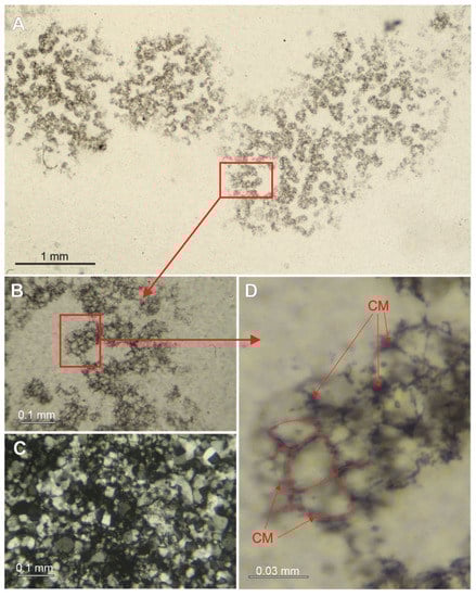 Microphotographs of moss agates (Figure 3G): accumulations of disseminated carbonaceous matter (CM) within the chalcedony matrix in transmitted light (A), enlarged fragment from the dark rounded segregation (as indicated in (A)) in transmitted light (B), and the same fragment between crossed nicols (C). (D) Enlarged fragment of selected area from (B), red dotted lines and arrows shows CM distribution between chalcedony grains.