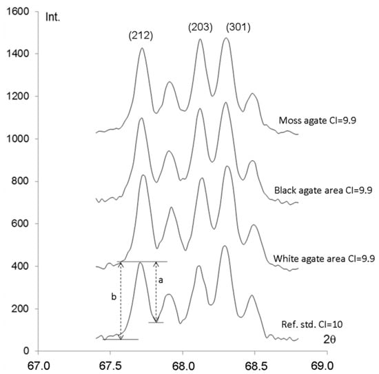 Fragments of X-ray diffractograms of the spherulitic agate, moss agate, black and white agate of concentrically zoning agate, and quartz crystal (Ref. std., Subpolar Urals), with the 2θ 68° quintuplet peak. a and b parameters are measured for Crystallinity Index (CI) calculation.