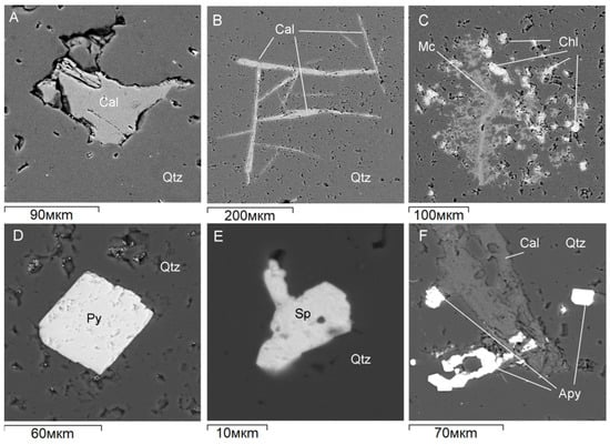 BSE images of micro-inclusions in black Onega agates: (A) calcite inclusion in the white area of the concentrically zoning agate, (B) calcite (Cal) inclusions in the black marginal area of quartzine spherolithe in spherulitic agate, (C) microcline (MC) and chlorite (Chl) in the white area of spherulitic agates, (D) prysmatic pyrite (Py) crystals in the colourless area of moss agate, (E) sphalerite (Sp) crystal in moss agate, and (F) quartz (Qtz) fissure filled by calcite, and accumulations of arsenopyrite (Apy) crystals in spherulitic agate.