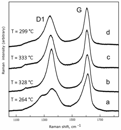 A Raman spectrum of CM is composed of two intensive G and D1 bands in the first-order region (1100–1800 cm−1). The graphite band G (~1580 cm−1) corresponds to the in-plane vibration of aromatic carbons in the graphitic structure [40]. The bands D1 (~1350 cm−1) and D2 (~1620 cm−1) appear in disordered CM, and they are assigned to defects in the graphitic structure [40,41,42]. In poorly ordered CM, at least two additional peaks, D3 (~1500 cm−1) and D4 (~1260 cm−1), can be decomposed in the first-order region of the CM Raman spectrum. Broad D3 band results from out-of-plane defects, related to tetrahedrally coordinated carbons, dangling bonds, and heteroatoms, occur in natural CM [40,41]. In poorly ordered CM, the D4 band appears like a shoulder of the D1 band (~1190–1250 cm−1). It has been tentatively attributed to sp2–sp3 bonds or C–C and C=C stretching vibration of polyene-like structures [43,44].