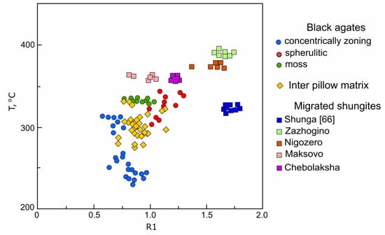 R1 vs. peak metamorphic temperature for the carbonaceous matter from black agates, inter-pillow matrix, and shungites from various deposits. Temperatures were calculated using the thermometer proposed by Kouketsu et al. [45]. Shunga [66].