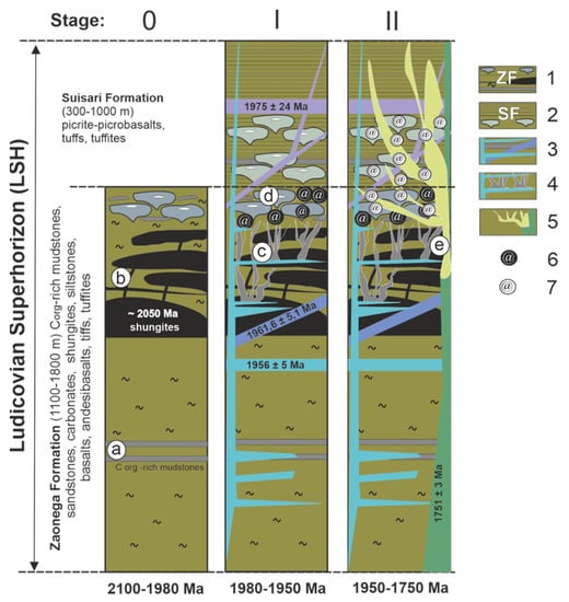 Summarizing the data on the geology, geochemistry, and texture of black agates from the upper part of ZF obtained in the present study and the results of a previous study of light-coloured agates from the lower part of SF [9], the agate mineralisation in LSH can be generalised into 2 stages, as illustrated in Figure 10. Agate mineralisation in LSH occurred after the formation of volcanic-sedimentary rocks of ZF (2100–1980 Ma), including carbon-bearing mudstones (Figure 10a) and shungite rocks (ca. 2050 Ma) [31] (Figure 10b)—pre-stage “0”.