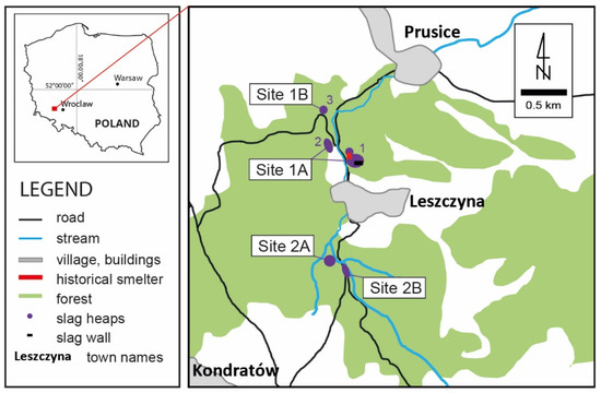 The material chosen for this study consists of slags and rocks (ores and ore-hosting rocks) collected in the vicinity of historical mining sites in Leszczyna and Kondratów. Approx. 30 kg of slag material was gathered from four distinguished sites to provide a representative amount of slag material. Twenty-six slag samples were selected for further analyses. The names of slag groups and waste piles are analogous to those distinguished by Kadziolka et al. [16], where variations in the chemical composition of local slags and suggested age variations between different waste piles are presented. Sites 1A and 1B are located near Leszczyna, in the northern part of the site, whereas Sites 2A and 2B are located near Kondratów village, in the southern part of the site (Figure 1).