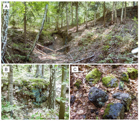 Photographs presenting slags in Sites 1A and 1B surrounding. (A) Historical entrance to the mine shaft and slag wall (on the top-right part of the photo); (B) slags used as building support near the historical shafts; (C) big slag blocks at the 1B site.