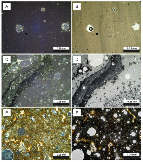 Microscopic images of slag samples in transmitted light in plane-polarized (left) and crossed-polarized light (right). (A,B) hyalite slags (glass and metallic phases (black)); (C,D) hypocrystalline slags (glass and crystalline phases); (E,F) holocrystalline slags (domination of crystalline phases).