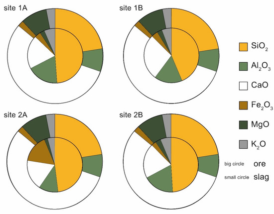 Historical documents indicate the use of gypsum (CaSO4·2H2O) and pyrite (FeS2) as additional fluxes [7]. Although pyrite can be considered geochemically justified (a marked increase in the content of Fe2O3 in the slag, especially at Site 2A (Figure 6)), the addition of gypsum is less likely, at least for its Ca concentration. The high initial CaCO3 concentration limited the need to use other additives containing calcium. However, gypsum and pyrite are desirable additions for their S content, which acts as a strong reducing agent during the metallurgical process required for carbonate- and sulphur-poor ores.