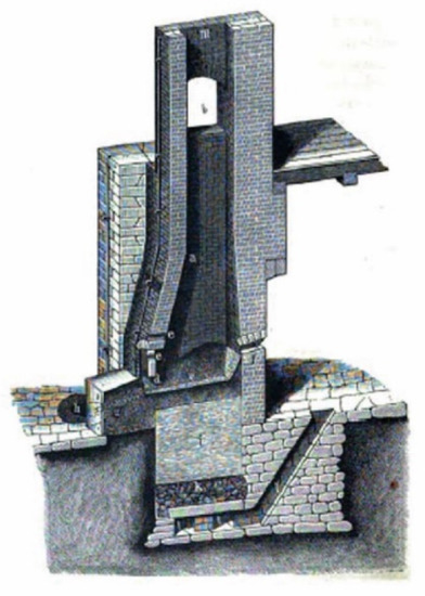 At the beginning of operations in 1865, the smelter used a tall (approx. 5 m high) shaft Mansfield-style furnace, which was loaded from the top [7] (Figure 7). The material movement was influenced by gravity, and the furnace charge was transported down to the zones with increasingly higher temperatures. The most intensive combustion occurred in the highest temperature zone, i.e., slightly lower than the blower nozzles, responsible for introducing additional oxygen. This area occurred at about a third of the shaft’s height (from the bottom). As a result of the physicochemical changes in the furnace, metal and gangue minerals were separated in a liquid form. Every 6 h, the drain hole was pierced, and melt flowed down the gutter to one of the two settling tanks [7,8]. Due to the density differences, the lighter slag melt flowed to the top, and metal concentrate accumulated underneath.