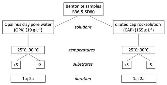 Long-term batch experiments were performed at the “Gesellschaft für Anlagen-und Reaktorsicherheit” (GRS, Braunschweig) using two temperatures and two types of solution, which were prepared under ambient atmosphere (Figure 1, Table S1). Bentonites were reacted in sealed glass vessels (flushed with argon 4.6, 99.996% purity, 2–3 min) with either a synthetic Opalinus clay pore water (OPA) [24] with a salinity of 19 g·L−1 or a diluted cap rock solution (CAP) [25] with a salinity of 155 g·L−1. The solid to solution ratio by weight was set at 1:2. The bentonite slurries were exposed to two different temperatures (25 °C and 90 °C) for periods of one and two years without compaction or shaking. To study microbial diversity, batches supplemented with organic substrate (+S) were compared to control batches without organic substrate (–S). The substrate-mix was comprised of 0.05 mol·L−1 sodium lactate, 0.05 mol·L−1 sodium acetate, 0.003 mol·L−1 methanol and 0.0001 mol·L−1 anthraquione-2,6-disulfonate (AQDS) to stimulate the indigenous, viable microbial community. The complete experimental setup, including gases, substrates, pore waters and bentonites, was not assembled under sterile conditions. However, the amount of microbial contamination in previous studies using the same setup prepared under sterile conditions was shown to be not significant [26].