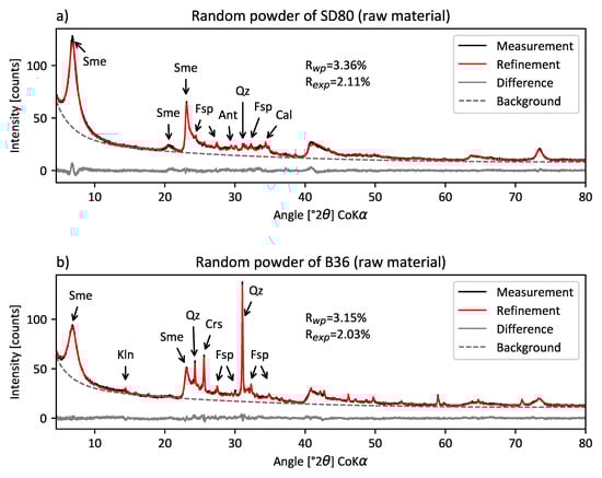 X-ray diffraction pattern of random powders from (a) SD80 and (b) B36 with Ant: anatase, Cal: calcite, Crs: cristobalite, Fsp: feldspars, Kln: kaolinite, Sme: smectite, Qz: quartz, Rwp: weighted residual square sum, Rexp: theoretical minimum value for Rwp.