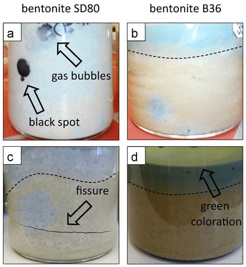 Color changes of both batches (SD80, B36) subjected to Opalinus clay pore water at 25 °C supplemented with substrate. Bentonite SD80 showed (a) the occurrence of black spots and gas bubbles after one year and (c) a horizontal fissure after two years. Bentonite B36 showed (b) a blueish coloration after one year and (d) a characteristic green coloration at the bentonite–solution interface after two years.