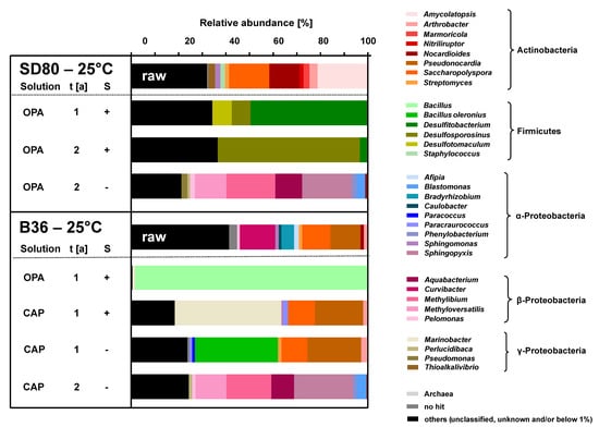 Microbial diversity in B36 and SD80 raw materials and samples incubated at 25 °C. Shown is the relative abundance of detected genera and their dependence on the added substrates (+S) and incubation time (t in years). The microbial community was analyzed by amplifying and sequencing the V4-region of the 16S rRNA gene via MiSeq Illumina (modified from Matschiavelli et al. [26]).