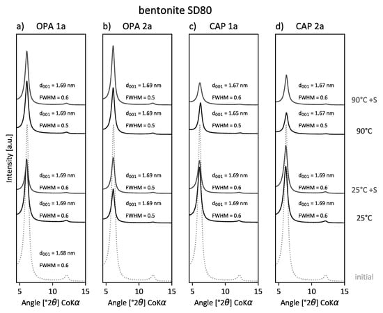 The SD80 samples subjected to OPA solution did not show significant changes in FWHM or d values over time or with increasing temperature (Figure 5a,b). The d001 values were at 1.69 nm, and the FWHM ranged between 0.5 and 0.6 Δ° 2θ. However, the XRD patterns of SD80 treated with CAP solution (Figure 5c,d) did show minor differences with d001 values between 1.67 and 1.69 nm, whereby the FWHM was constant at 0.6 Δ° 2θ. Only the d001 of SD80 reacted for one year at 90 °C without substrate (–S) showed a more significant shift towards smaller d values with d001 = 1.65 nm. Overall, the d001 reflection intensity of the reacted SD80 smectites notably decreased with increasing temperature conditions.