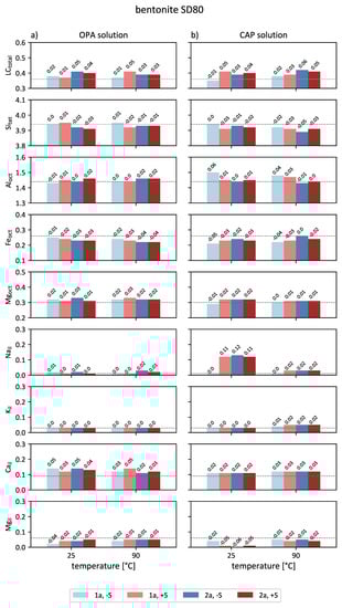 In contrast, the SD80 samples subjected to CAP solution showed an uptake of Na+ into the interlayer with a decreasing amount of substitution with increased temperature (Figure 7b). Compared to the initial sample, the Na+ in bentonites reacted at 25 °C increased by 0.11–0.12 e·phuc−1. The only exceptions were the one-year control samples reacted at 25 °C and 90 °C, which did not show any differences in Na+ content. The K+ content of the 25 °C samples also showed no change, and only minor changes were observed for 90 °C samples with an increase by up to +0.02 e·phuc−1. Overall, enhanced amounts of interlayer Ca2+ (0.02–0.03 e·phuc−1) and depleted amounts of Mg2+ (0.01–0.06 e·phuc−1) were observed under elevated temperatures.