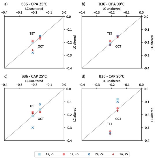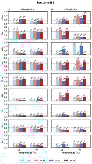 The total LC of B36 subjected to CAP solution showed only minor changes at 25 °C, whereas samples reacted at 90 °C had increased layer charges up to 0.06 e·phuc−1 in control samples and up to 0.14 e·phuc−1 in substrate-bearing samples (Figure 8b). The only exception was the two-year control sample at 25 °C, which showed similar changes compared to the control samples reacted at 90 °C. The 90 °C samples displayed an overall decrease of tetrahedral Si4+ between −0.11 e·phuc−1 and –0.14 e·phuc−1. Whereas no changes in octahedral charge were observed for the substrate-bearing samples (Fe3+ substitutes for Al3+), the octahedral charge decreased up to 0.08 e·phuc−1 in the control samples. This was caused by a significant increase of Al3+ (up to 0.16 e·phuc−1) along with a decrease of Fe3+ (−0.08 e·phuc−1) and Mg2+ (up to −0.08 e·phuc−1) in the octahedral sheet.