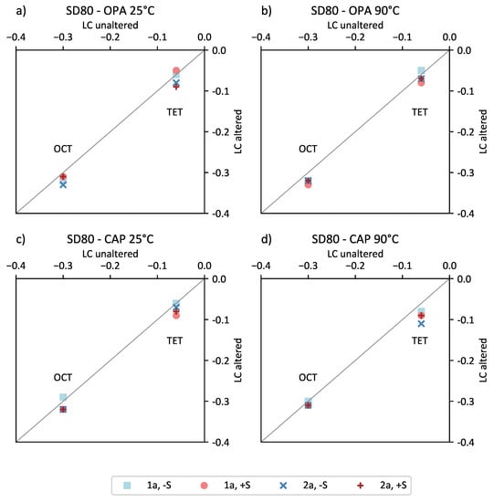 In comparison, the increased LC in OPA-reacted SD80 samples correlated with the uptake of interlayer Ca2+ at 25 °C and 90 °C, whereas in CAP-reacted samples, a constant increase in Ca2+ was observed at 25 °C and 90 °C. Additionally, CAP samples at 25 °C showed a noticeable increase in Na+, which correlated with LC, and a decrease in interlayer Mg2+. At 90 °C, this trend was diminished but accompanied by an increase in K+. These trends indicate solution-dependent changes whose implications will be discussed later.