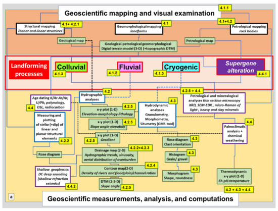 A holistic-multidisciplinary study cannot be performed in a simple way and presented as a unidirectional workflow. The various parameters, disciplines, and methods as well as processes and landforms are closely interlocked with each other so that the links between them have to be illustrated at the beginning in a special diagram. The qualitative-quantitative approach taken in the current study is illustrated in a binary flow chart with multiple links on display and the same codes numbering the (sub)sections in the text are used in both flow charts, too (Figure 2a,b). Figure 2a is linking methods and results and Figure 2b the genetic model with the discussion. The genetic flow chart is to link genetic parameters with landforms of fluvial, mass wasting and cryogenic processes and arranged stage-wise in chronological order.