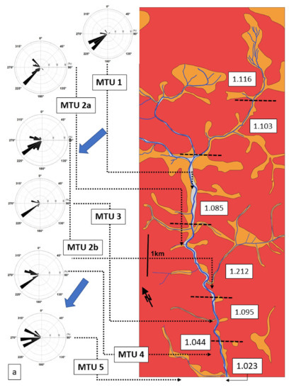 The drainage maps (2-D) are simplified geological maps only revealing the geological and hydrographic relevant items such as the bedrock which is subdivided into basement and foreland (Figure 8, Figure 9 and Figure 10). The hydrographic system is split up into the recent channel system/ floodplains and ancient floodplains/depositional terraces. To allow for a direct comparison between the direction of the talwegs of the 1st and 2nd order channels and the tectonic features, rose diagrams are added up to these maps (see previous paragraph). The degree of the sinuosity is also integrated into these composite maps. Numerical parameters to describe the sinuosity of fluvial channel systems were proposed by Horacio (2014) and Turowski (2018) [52,53]. In the current study a modified approach has been taken based upon the ArcGis software 10.2.2 and the sinuosity is calculated as follows: ratio S = channel length/valley length (Table 2). An ideal straight channel yields a sinuosity degree of S = 1.