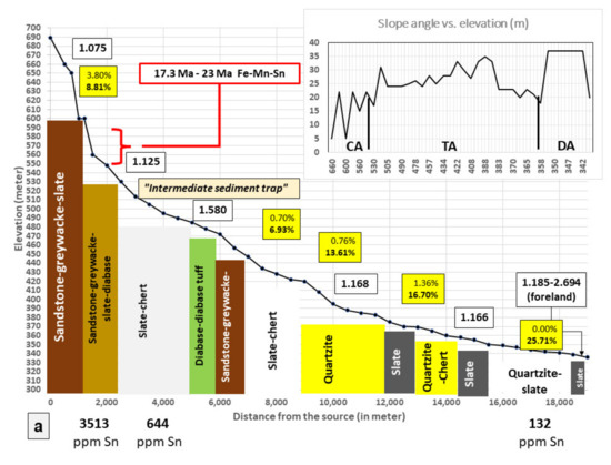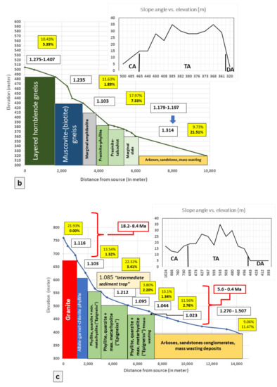 Hydrographic analyses: The hydrographic analysis makes use of x-y plots (1-D), drainage and contour maps (2-D) and in one case also of DTM (3-D). The longitudinal profiles of the SSS reference drainage systems are plotted as function of the bedrock lithology in x-y graphs displaying the elevation vs. distance from the watershed in meters (Figure 11). The data have been collected from the topographic map and in the field and the lithology is determined by mapping and petrological analyses (Figure 2a). The slope angle diagram is identical as far as the x-axis is concerned with the host graph (Figure 11a–c). The y-axis, however, is different and yields the maximum slope angle measured with a tilt sensor in the field from the divide to the footslope and calculated from the numerical data which were also used for the construction of the 3-D diagrams (Figure 3, Figure 4 and Figure 5). The slope angle can be deduced from this sub-diagram and correlated with the three facies zones CA (zone of headwaters), TA (transport area), and DA (deposition area).