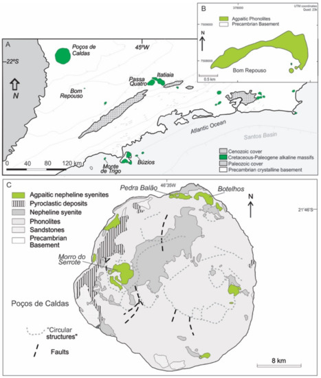 One of the largest alkaline igneous bodies in the world [42], Poços de Caldas intrudes Precambrian rocks, forming an isolated circular complex detached from numerous Late Cretaceous alkaline occurrences of the Alto Paranaíba (to the NE) and the Serra do Mar (to the SE) provinces (Figure 2C). The size of this intrusion (>800 km2) is smaller than Khibina massif (Kola Peninsula, ~1350 km2; [66]) but comparable to that of Lovozero (Kola Peninsula, 600 km2; [66]) and Pilanesberg (South Africa, ~625 km2; [67]). The massif includes dominant phonolites and their subvolcanic and plutonic counterparts (tinguaites and nepheline syenites, respectively), with a presence of strongly agpaitic types (lujavrites and khibinites) that are especially abundant in the northern ring area (Pedra Balão).