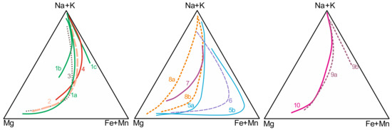Agpaitic and miaskitic types can be identified via mineralogy which changes from one type to another [1,7,8]. On this basis, according to [7], the miaskitic types characteristically contain zircon, baddeleyite and titanite, whereas the agpaitic types contain aenigmatite, astrophyllite, eudialyte, lamprophyllite, F-disilicates, and wadeite. In addition, a detailed distinction between “normal” miaskitic variants and low, medium and highly agpaitic up to hyperagpaitic types, depending on the presence of diagnostic minerals, was previously proposed by [9].