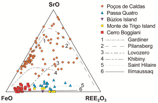 Suppression of such phases is responsible for the enrichment of the residual magmatic liquids with incompatible elements, which onsets the crystallization of HFSE- and REE-F-rich minerals. At the end of this crystallization path, phases containing CO2 and H2O in their composition form as REE-carbonates and REE-fluorocarbonates. Therefore, according to the abovementioned authors, the magma that originated the Passa Quatro agpaitic rocks is characterized by geochemical traits such as enrichment in incompatible elements (HFSEs, REEs), high F, and minor CO2 and H2O under low oxygen fugacity and water activity conditions.
