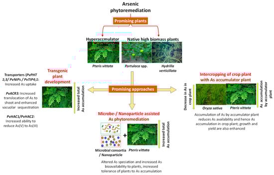 There are various approaches of As phytoremediation that can be utilized judiciously for remediation of contaminated sites. Various approaches are summarized in Figure 1 and are discussed below. Recent studies demonstrating the potential of various approaches have been presented in Table 1.