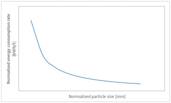 Recently, environmental aspects have been gaining greater attention, especially in terms of decreasing the negative impact of mechanical processing operations on the environment and society; in particular, attention has been paid to harmful and annoying emissions of dusts, gases, heat, and noise. Operations of industrial comminution account for as much as 3% to 5% of the total usage of electric energy in the world []. Despite this, their performance effectiveness is relatively low and has an inverse relationship to the size of the crushed material. For example, the energetic efficiency of tumble mill operation is estimated to be around 15%. Meanwhile, the production efficiency of some types of very fine grinding products can be as low as 1% []. Comminution energy utilization is higher in crushers, particularly in impact crushers. However, it is dependent on the type of raw material used and the crushing stage within the technological circuit []. Research generally confirms that crushing uses between 0.5 and 1 kWh/Mg, and that crushing devices using attrition and shear forces consume between 40% and 80% more comminution energy than machines based on impact forces []. Compression and impact forces techniques in material disintegration save the most energy. However, the low energy utilization for a breakage mechanism in conventional crushing and grinding equipment leads to the development of innovative comminution technologies [].