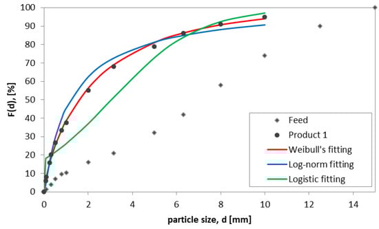 The use of the correct modeling approach assists in the description of an operation, as well as the results achieved for specific operations in mineral processing. These have significant cognitive meaning, especially for conditions beyond the operational regime, such as an increased throughput, exceeded values of operational parameters of devices (i.e., increased Fsp in HPGR, higher rotational speed of shaft in impactors, higher/lower amplitude/frequency of vibration screen), and others. These situations, however, are undesirable and efforts have been made to eliminate them or at least to limit their impact on the process course. The issue of greater significance is the possibility of the assessment results of mechanical processing proceeded through specific operation. Comminution results seem to be the most important among them, and the most popular approach consists in approximation of PSD of crushing products []. The second significant issue seems to be assessment of the useful mineral liberation degree, but nowadays it appears that only analytical methods utilizing scanning electron microscopy (SEM), such as MLA, can be effective. The PSD approximation method is not new and has been present in mineral processing investigations for decades. It consists of the assumption that the act of particle breakage is a kind of probability, especially concerning the size of newly created particles in the crushing product [,]. The approximation of crushing results technically utilize the Least Squares method (LS) and can be performed by means of various mathematical functions (distributions). Most of these have a confirmed application into a specific type and size of feed material and crushing device []. For example, the Weibull (or RRB) distribution was introduced into mineral processing in the 1930s [] for the assessment of the particle size of crushing products. Log-norm distribution, in turn, has found application for the approximation of fine crushing (grinding) products []. In recent decades, functions previously used in other disciplines have also been used in mineral processing. The logistic distribution could be such an example. Approximation functions used in the estimation of particle size distribution of crushing products usually have two parameters, denoted as shape and scale parameters. It is worth mentioning that the application of theoretical distributions with a greater number of parameters may improve the modeling results; however, problems can appear in the interpretation of results, especially when the model is used in more general cases. So-called “censored distributions”, (i.e., theoretical distributions with additional parameters that limits the particle size of the product by introducing minimum or maximum particle (dmin or dmax)) can be more efficient in some cases [].