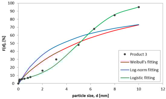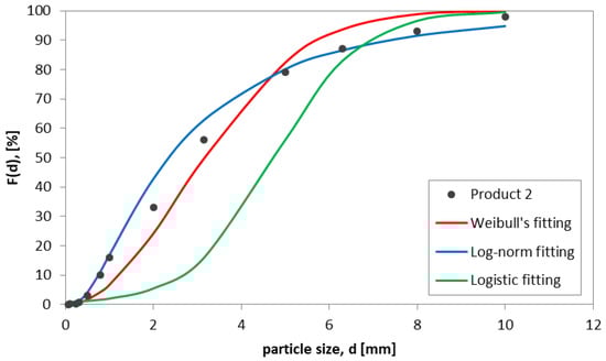 When the feed material was crushed under a lower pressing force, the particle size composition of the obtained product could be adequately described with the use of a log-normal distribution. Detailed characteristics of the approximation in terms of fitting error values are given in Table 3.