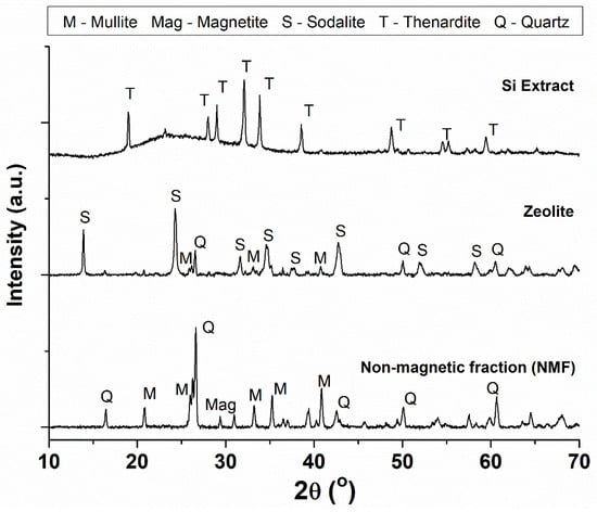 Liquid phase, alkaline treatment of the NMF was carried out at 150 °C and resulted in a solid zeolite product and filtrate solution. The Si extract was precipitated from the filtrate solution by addition of a mineral acid. The variation in the mineralogical content between the NMF, zeolite and Si extract were analysed by XRD (depicted in Figure 4). Most of the quartz and mullite mineral phases present in the NMF material were converted to a crystalline zeolite product (hydroxysodalite) during the liquid phase alkaline treatment process. Zeolitisation occurred via chemical processes of hydrolysis/depolymerisation and dissolution (Equations (3)–(6)), and subsequently, condensation/polymerisation (Equation (7)) of aluminosilicate species (T = Al or Si) to form a crystalline zeolite framework, as adapted from Feijen et al. [63]. It is noteworthy that no solid waste was produced during the zeolitisation process. The Si extract was composed of amorphous silica and a sodium sulphate (Na2SO4) crystalline mineral phase called thenardite [64,65,66].