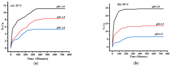 Isotherms of chalcopyrite dissolution and recovery of Cu in leachates using media with different pH values and conducted at (a) 25 °C and (b) 50 °C.