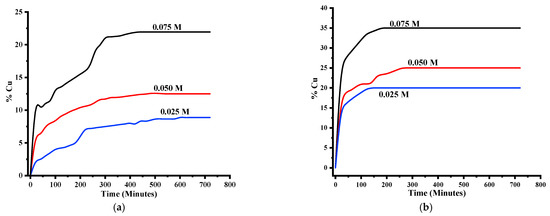 Effect of Fe3+ on Cu dissolution (rate and recovery): (a) dissolution at 25 °C and (b) dissolution at 50 °C.