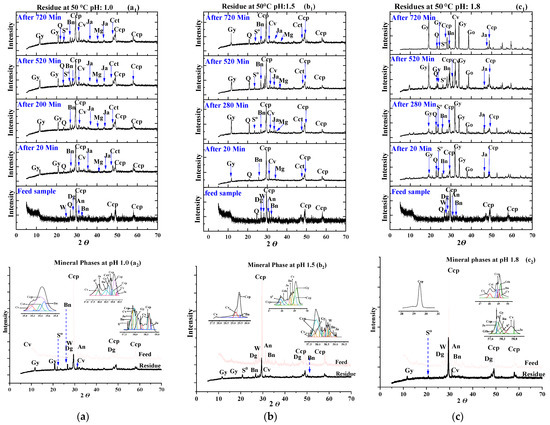 Figure 5 shows the mineral content of the leached residues at 50 °C for the various pH conditions (1.0, 1.5 and 1.8) and compares their evolution to the feed sample. It was observed that the CuFeS2 leached residue main peaks (2θ: 29.46, 48.93 and 57.95) appeared to have decreased in their intensity compared to the feed sample. In addition, the XRD analysis revealed that the other copper phases different from CuFeS2 also dissolved and contributed to the overall Cu recovery. It was observed that anilite (Cu7S4) and digenite (Cu9S5) disappeared during the dissolution (Figure 5a–c), their contribution to the overall Cu dissolution if completely dissolved is 5% Cu. At pH 1.8, the total Cu was 24.7%, suggesting that Cu from CuFeS2 also dissolved. Further, new copper sulphide phases were observed in the leached residues. These phases were low and inexistent in the feed sample and included chalcocite (Cu2S) and covellite (CuS). These new phases could be attributed to the dissolution of CuFeS2 by forming intermediate phases. The presence of these Cu-rich intermediates appeared to support an earlier investigation by Acero et al. [30] which underlined the preferential dissolution of Fe over Cu, leading to the formation of a Fe deficient chalcopyrite mineral (defect chalcopyrite structure Cu1−xFe1−yS2−z) to which our identified species could be part.