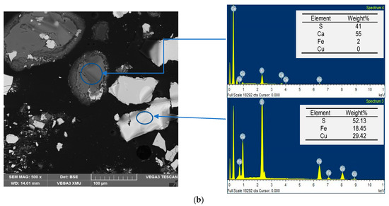 Leached residues morphology and chemistry (SEM-EDS): (a) displaying the mounted sample where the CuFeS2 is locked or enveloped by Cu rich intermediate phases (Cu-S); (b) showing the unmounted sample where the Ca phase (Gypsum) represents the dissolution barrier.