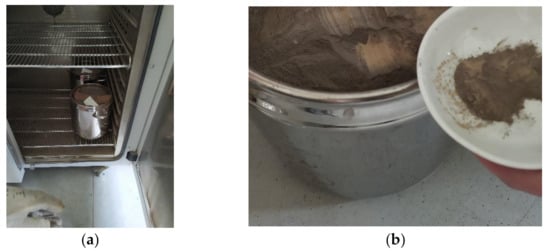 (a) Thermal loading of bentonite powder in open vessels, and (b) visible colour change from light brown to dark brown at the powder surface observed during sampling.