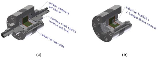 Bentonite dry densities of 1400, 1600, and 1800 kg/m3 were chosen for determining saturated hydraulic conductivity and WRC. Bentonite powder was compacted in the cylindrical space of a cell body (diameter of 30 mm, thickness of 15 mm) using a hydraulic press MEGA 11-300 DM1S (FORM+TEST Seidner & Co., Riedlingen, Germany). In the WRC experiments, a hole was drilled for placing a wireless sensor (diameter of 17 mm, depth of 6 mm). The compacted sample was closed with end plates composed of stainless steel fabrics placed on the carbon composite percolator [32]. Three-quarter section views of the experimental cells are shown in Figure 2.