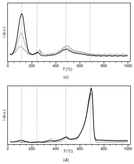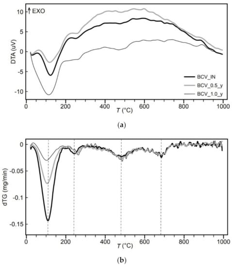 The results of simultaneously performed thermogravimetry (TG) and differential thermal analysis (DTA) supplemented with mass spectrometry identification of evolved gases can be seen in Figure 3. Variability of endothermic and exothermic processes in DTA curves suggests a complex composition of BVC bentonite. Four major mass losses were identified from the derivative thermogravimetric (dTG) curves: at approximately 30–200, 200–300, 300–600, and 600–800 °C. Water-related mass losses were found for the first three processes. A shift of 240 °C peak of BCV_IN to higher temperatures was observed for thermally loaded samples. The same shift was also observed in the EGA curves of evolved water. Another difference in the EGA curve for CO2 can be seen at 105 °C and in the region of 350–550 °C. A very low signal for SO2 was registered around 800 °C, decreasing in order: BCV_IN > BCV_0.5_y > BCV_1.0_y.