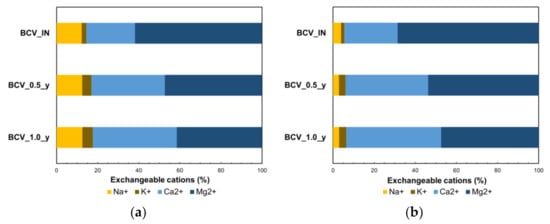 Depending on the CEC data processing and, thus, considering the dissolution reactions followed by the cation exchange reactions, the sodium population has significantly changed, because Na+ was identified as the major water-leachable cation. Nevertheless, the trends in the exchangeable cations are identical regardless of the CEC data processing. Most of the exchangeable sites in BCV bentonite were occupied by magnesium and calcium. The exchangeable cations in thermally loaded samples varied with heating time. Magnesium proportion decreased at the expense of calcium and potassium; sodium remained unaffected upon heating.