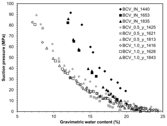 Water retention ability for all dry densities decreased with the thermal loading period. This behaviour was more relevant for lower water content; for water content above 20%, the water retention ability of both thermally unloaded and thermally loaded samples became closer to each other. This trend was also observed by [9]. The most significant difference is between the BCV_IN samples and the BCV_0.5_y ones; the difference between BCV_0.5_y and BCV_1.0_y is minor. It indicates that most of the material changes took place during the first half-year of thermal loading. This fact corresponds well with SSA values, where between BCV_IN and BCV_0.5_y, a crucial decrease was observed, whereas between BCV_0.5_y and BCV_1.0_y no visible change was detected.