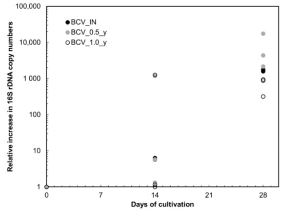 Generally, the DNA extraction resulted in very low DNA yields, as revealed by Qubit measurement. Therefore, the qPCR method by 16S rDNA marker was used to better distinguish between the samples and estimate the changes in gene copy number in the studied samples. The quantification cycle (Cq) values were related to the Cq values of freshly mixed suspensions (0 d) for each bentonite powder to quantify the magnitude of relative change in gene copy numbers. The PCR efficiency for the 16S rDNA marker was estimated beforehand by measuring the slope of curves constructed from a serial dilution of template DNA from several environmental samples. Relative quantification, displayed in Figure 6, showed an increase in the relative abundance of 16S rDNA copies in all samples after 28 days of cultivation in anaerobic conditions. The relative increase varied among samples. The highest relative increase was detected in BCV_0.5_y samples after 28 days of cultivation. A slightly lower relative increase was found for BCV_IN. The lowest relative increase in the gene copies was determined for BCV_1.0_y. Our data also show that 14 days of recovery time for restoring microbial activity from dormant stages is insufficient for most samples.